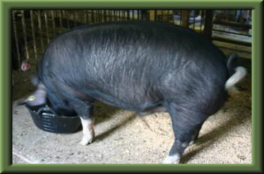 スモーリーコンベファームよりつれてきた、ピーターラッドは、発育も良く、体のバランスが良く特に後脚は、柔軟かつ丈夫で、柵の上に前足を架け、管理者があらわれるのを、いつも待っています。繁殖成績も良く、雌系、雄系ともに基礎種豚として使うのに適しています。6白のうち、顔の部分の白は、白毛が何本か出ている程度です。同腹産子数12−離乳11