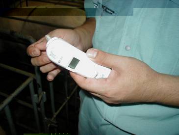 多くの農場では、棒状の水銀体温計を肛門につきたてて、温度計測しているようです。